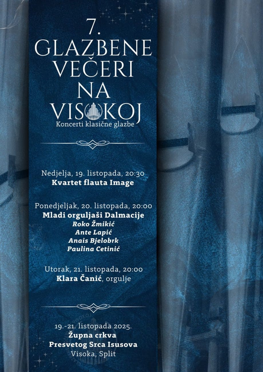 U župnoj crkvi Presvetog Srca Isusova na Visokoj od 19. do 21. listopada 2025. održat će se 7. Glazbene večeri na Visokoj, trodnevni festival posvećen klasičnoj glazbi i mladim glazbenicima. Ovaj već tradicionalni ciklus koncerata okuplja renomirane i nadolazeće izvođače te donosi raznolik program u intimnom i inspirativnom prostoru splitske župe.