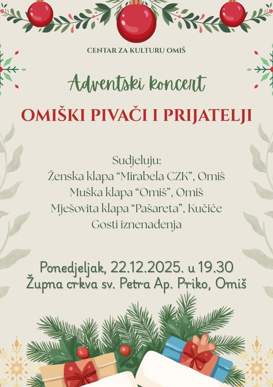 U organizaciji Centar za kulturu Omiš, omiška publika i svi ljudi dobre volje večeras će imati priliku uživati u adventskom klapskom koncertu uoči blagdana Božića.