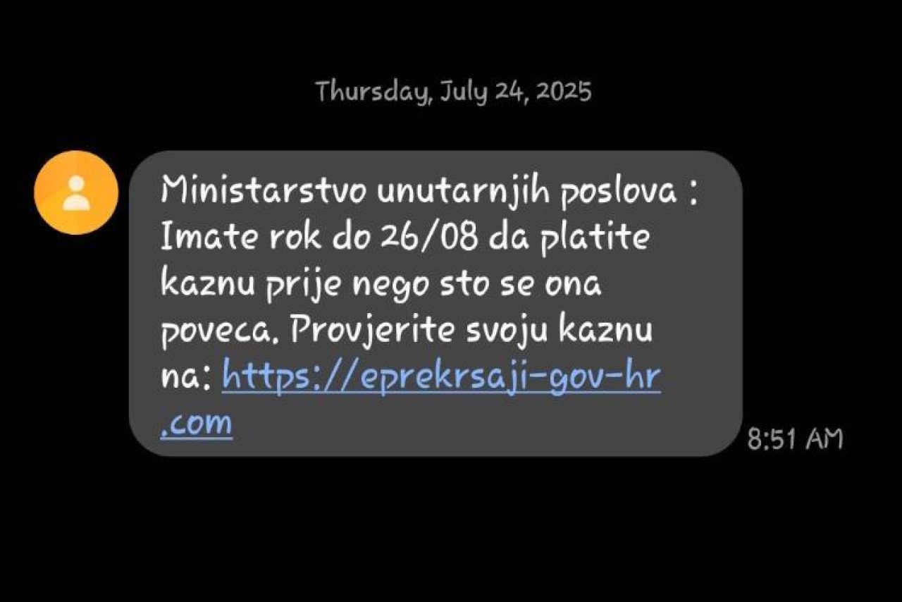 Policija upozorava građane na SMS poruke u kojima se počinitelji lažno predstavljaju kao Ministarstvo unutarnjih poslova. U porukama se građane poziva da u određenom roku plate kaznu putem internetske poveznice koja vodi na lažnu (phishing) mrežnu stranicu, osmišljenu tako da izgleda kao službena stranica Ministarstva unutarnjih poslova i sustava e-Prekršaji. Na toj stranici od građana se traži unos osobnih podataka te podataka s bankovne kartice, uključujući i CVV broj. Maliciozna mrežna stranica je u međuvremenu deaktivirana i trenutačno ne predstavlja opasnost. Ipak, građani se pozivaju na dodatan oprez.