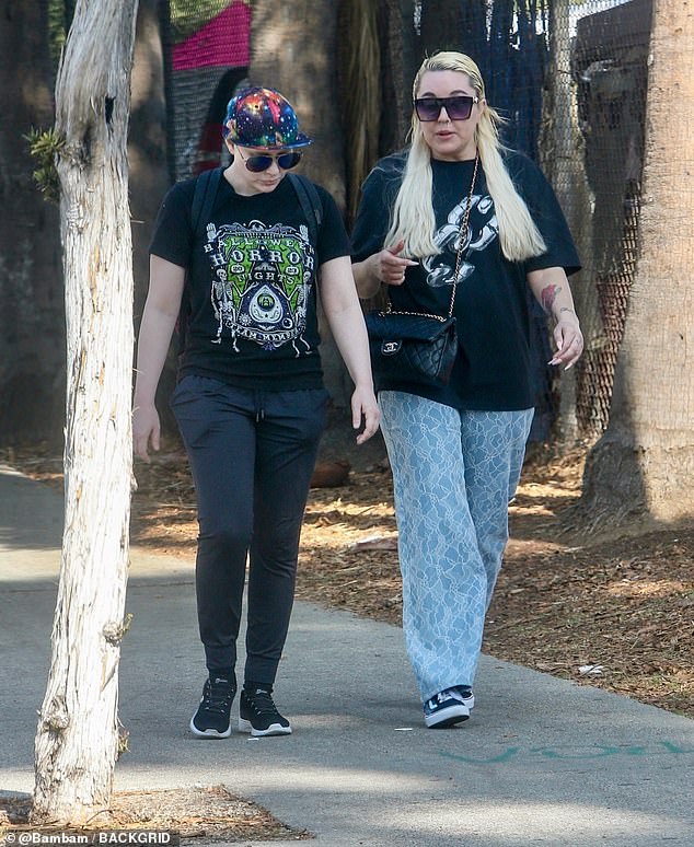 Izbijeljena plavokosa kosa Amande Show Alum razdvojena je sa strane dok su ona i njezina prijateljica, u majici Halloween Horror Nights, napravili nekoliko pregledavajući na buvlju tržnici.