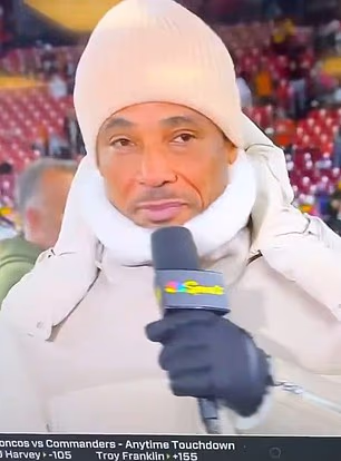 Bivša zvijezda Patriotsa Harrison, 52, pridružio se NBC-jevom timu analitičara za nedjeljni nogometni okršaj između Denver Broncosa i Washington Commandersa na stadionu Northwest.
