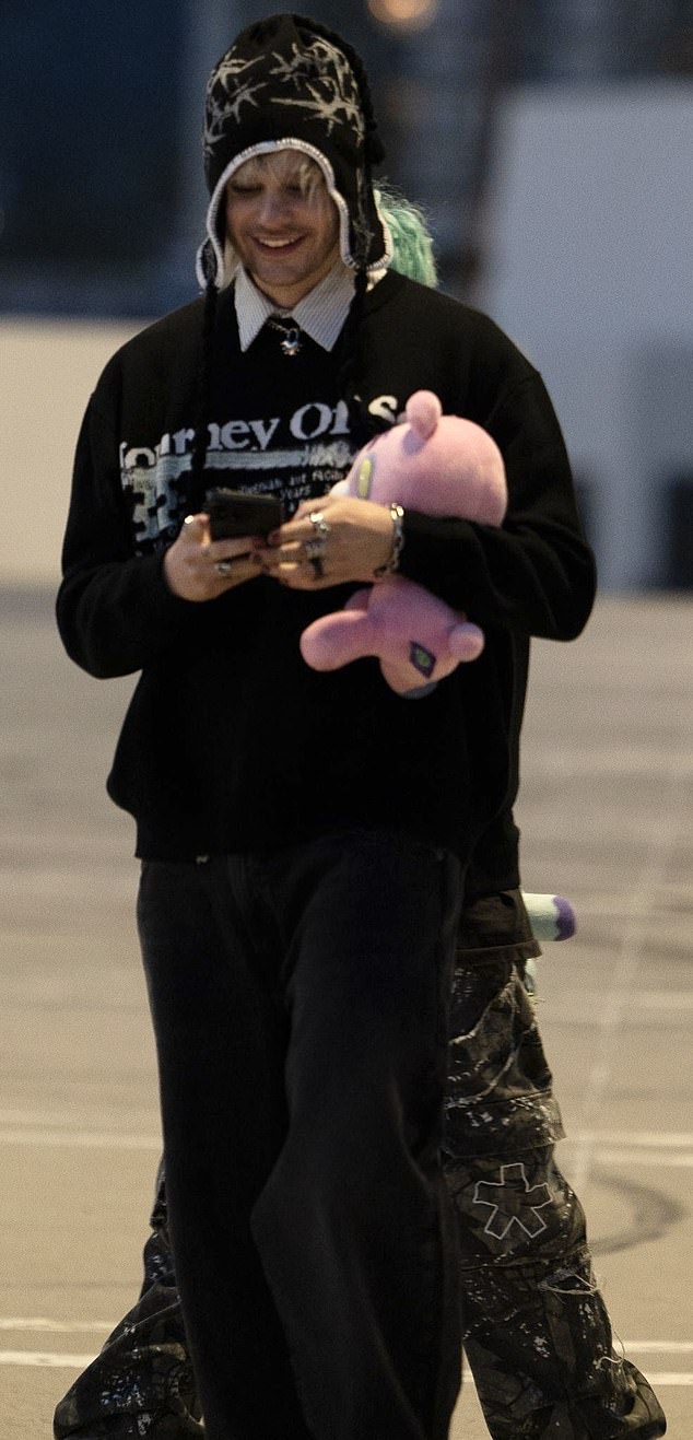 Aussie Rocker, 29, viđen je u prevelikoj crnoj kapuljači na slojevitoj preko prugaste košulje i ukrašen srebrnim nakitom, stežući ružičastu plišanu igračku dok se pomiče na telefonu