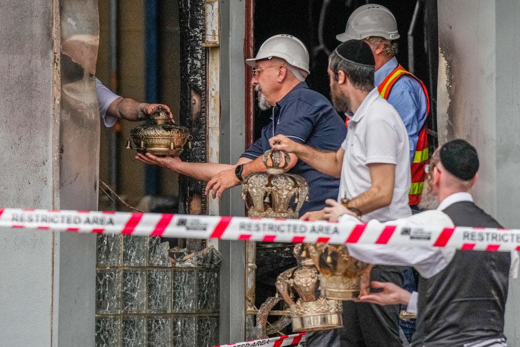 Članovi izraelske sinagoge Adass vraćaju predmete nakon podmetanja požara 6. prosinca 2024. u Melbourneu, Australija. (Asanka Ratnayake/Getty Images)