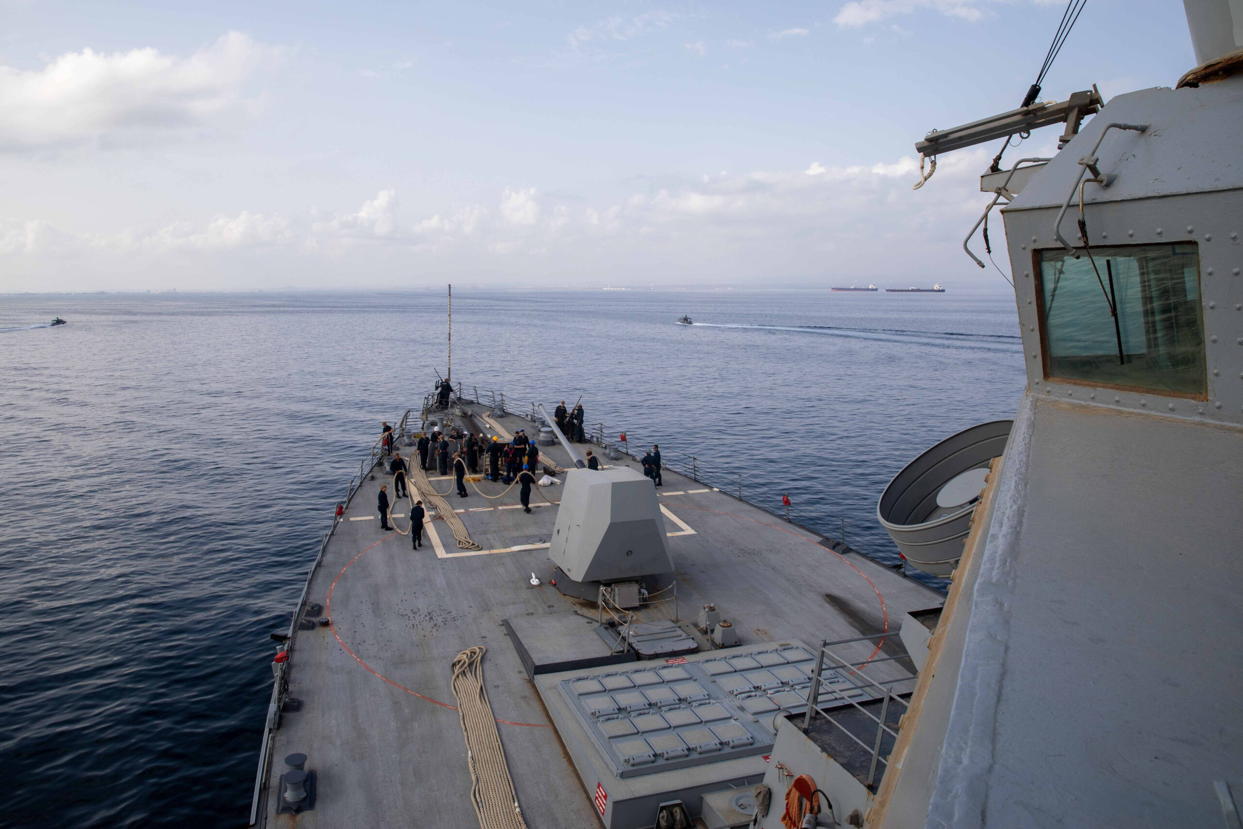 Jedan mogući scenarij je pružanje vatrene zaštite za trgovačke brodove. Vojni stručnjaci procjenjuju da bi mogla biti potrebna do dva ratna broda po tankeru ili oko desetak brodova za konvoj od pet do deset civilnih plovila. To bi također zahtijevalo stalne zračne patrole izviđačkih dronova MQ-9 Reaper i napade na iranske lansere raketa na obali.