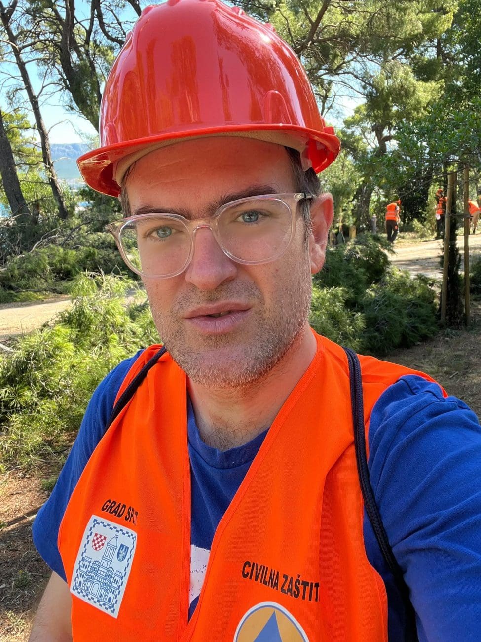 Na fotografiji se Barbir nalazi u zaštitnom prsluku Civilne zaštite i kacigi, dok iza njega volonteri i djelatnici Javne ustanove intenzivno raščišćavaju staze i uklanjaju oboreno granje.