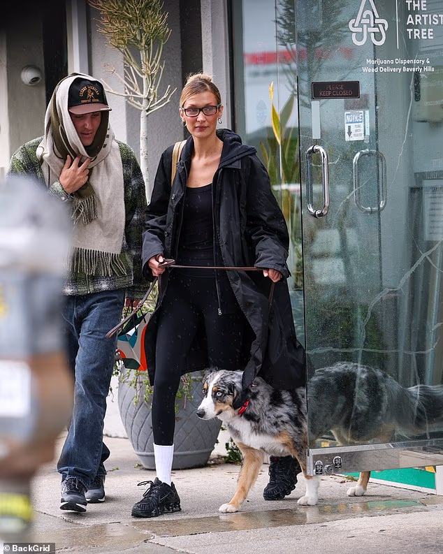 Bella Hadid, 29, u utorak je viđena kako odlazi iz dispanzera marihuane na Beverly Hillsu u Kaliforniji sa svojim agentom Josephom Thornton-Allanom i svojim psom po nadimku Glizzy P. Beans