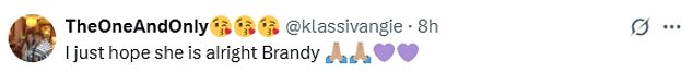 ‘Nadam se da je Brandy dobro’, napisala je jedna osoba na Instagramu. ‘Bog blagoslovio Brandy, osjećaj se bolje’, uključio se drugi.