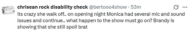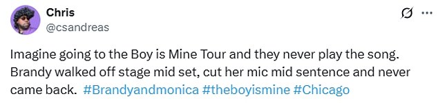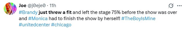 ‘Brandy je samo dobila napad i napustila pozornicu 75 posto prije nego što je nastup završio, a Monica je morala završiti nastup sama!’ jedan je sudionik uprskao X.