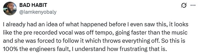 ‘Čini se da je unaprijed snimljeni vokal bio izvan tempa, išao je brže od glazbe i ona ga je bila prisiljena slijediti, što sve poremeti’, složio se netko.