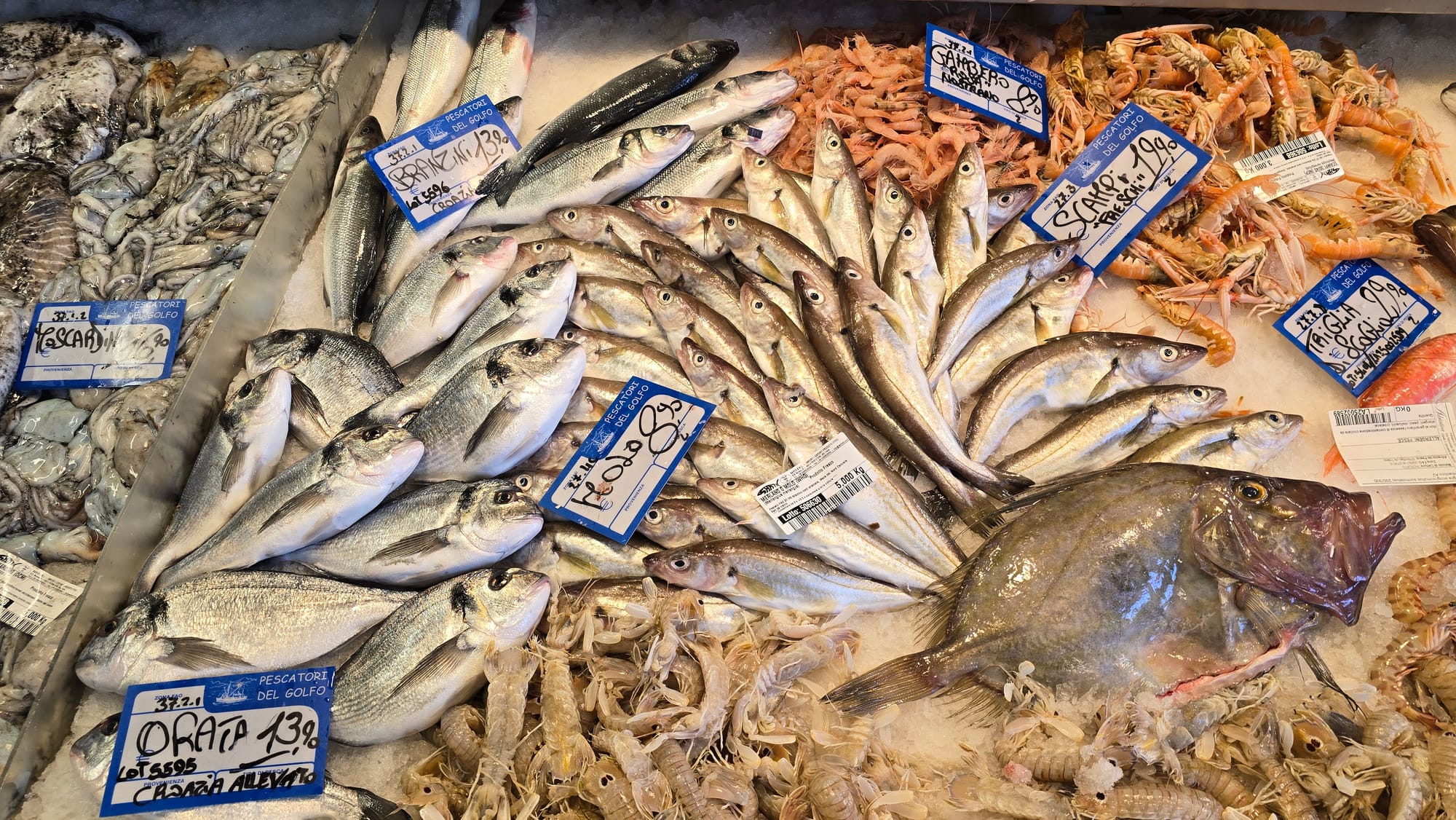 U Trstu smo najprije svratili u jednu od ribarnica i naišli na sljedeće cijene: Sipa se prodaje za 19.90 EUR, hobotnice za 28,90, orada iz uzgoja za 13,90, a toliko koštaju i brancini, mol ili oslić 8,90, a po istoj cijeni prodaju se i gamberi, dok su škampi 19,90. Cipli su 8,90, trlje kamenarke 29,90, a divlji brancini od 24,90 do 36,90 EUR. Pagar se cijeni po 12, a inćuni su čak 13,90 EUR.