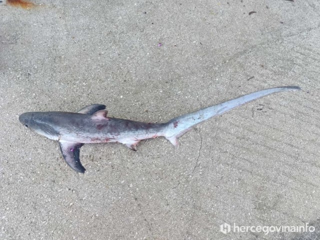 U akvatoriju kod Neuma ovih je dana zabilježen neobičan, ali i tužan prizor – ribar je u slučajnom ulovu izvukao mladunče morskog psa lisice (Alopias vulpinus), vrste rijetko viđene u našim vodama.