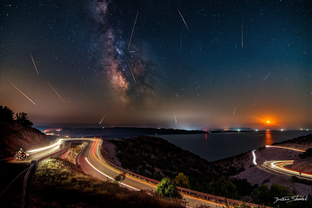 “Vrhunac meteorskog roja Perzeida (tzv. suze sv. Lovre) iznad najdraže mi ceste na Braču, s Vidove gore prema Veloj Farskoj koja gleda na Hvar i, u ovu uru, na Mliječnu stazu. U daljini, dim od strašnog požara u Rupotinama kraj Solina zavio je Mjesec u krvavu boju, dok je zalazio na pučini između otoka Visa i Svetog Andrije.