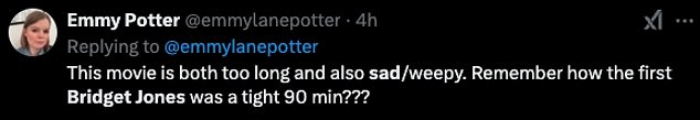 Dok se drugi žalio: ‘Ovaj novi film Bridget Jones toliko je depresivan i rastužio me čak i sa sretnim završetkom’.