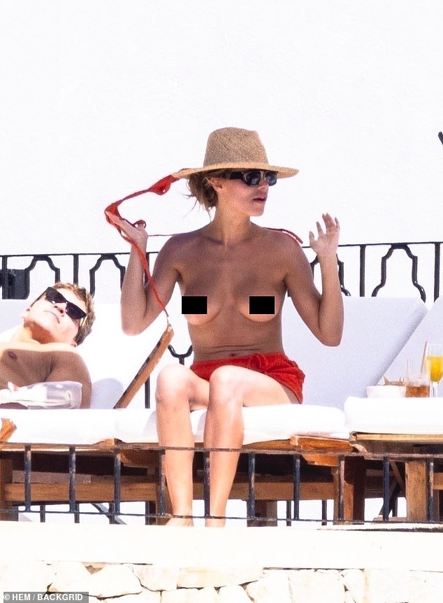 Kako bi izbjegao tane linije, 29-godišnja manekenka skinula je svoj narančasti bikini vrh, a kasnije je viđena kako pozira za fotografije dok je njezina prijateljica srušila.