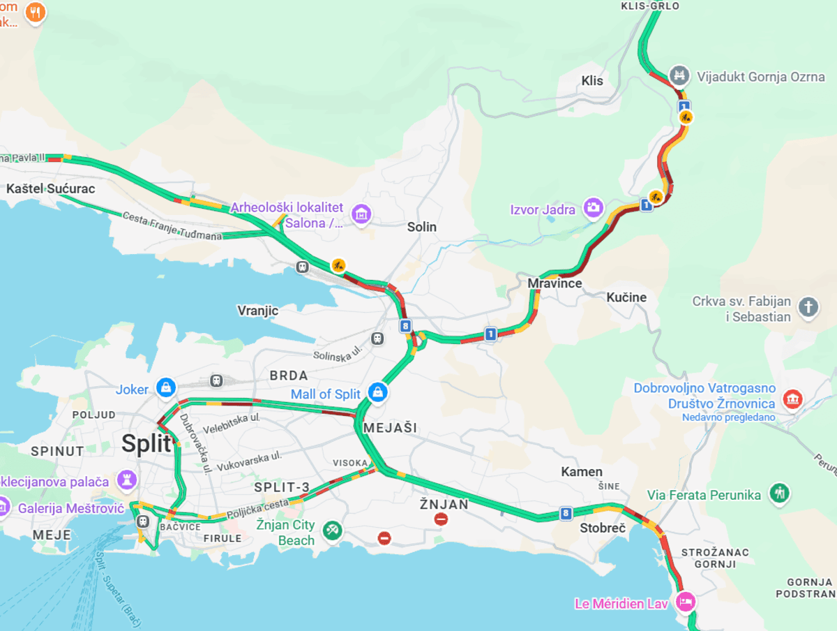 Promet u Splitu i okolici danas je izrazito gust, posebno na izlazima iz grada. Zatvorena je brza cesta Solin-Klis. zbog prometne nesreće koja se dogodila ranije. Nešto bolja situacija je u suprotnom smjeru, odnosno iz smjera Dugopolja prema Splitu, gdje se prometuje usporeno.