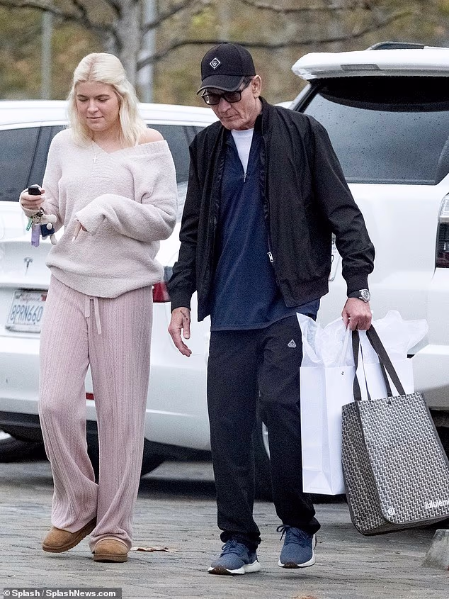 Zvijezda Dva i pol muškarca (60) držao se povučeno u tamnoj ležernoj odjeći i bejzbolskoj kapi dok je hodao pored 20-godišnje Lole, koja je bila udobno odjevena u salonke i provjeravala svoj telefon dok se par probijao kroz parkiralište.