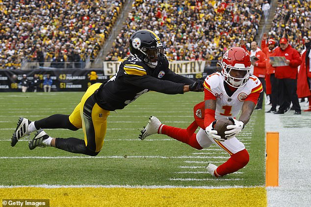 Xavier Worthy uzima dodavanje od sedam jardi od Patricka Mahomesa do pilona u Pittsburghu