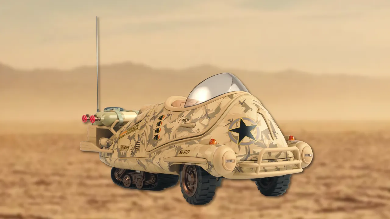Desert Sandtrack Flea dizajniran je kao jedan od seta od tri izdana 2025. koji su dodatno proširili koncept originalnog Flea dizajna. Prethodno smo dizajnirali vojni izviđač Flea, koji je bio oslikana verzija osnovnog dizajna. Za Desert Sandtrack Flea, htjeli smo pomaknuti dizajn puno dalje i prenijeti ideju izviđača Fleasa u najudaljenije kutove bojišnice. Po mom mišljenju, ovo je moglo biti eksperimentalno vozilo koje je Chryslus stvorio za potrebe koje se nikada nisu razvile, ili je možda doživjelo aktivnu upotrebu. Ljepota od Fallout svemira je da postoji toliko mnogo mogućnosti događaja i proizvoda unutar opsega svemira o kojima tek trebamo naučiti. Zgodna stvar kod dizajna je ta što uzima standardnu Flea karoseriju i razvija je sa zdepastim gumama naprijed i gusjenicom straga, a zatim odsijeca nadstrešnicu kako bi napravio nisko vjetrobransko staklo. Izgleda sjajno i savršena je evolucija osnovnog dizajna.