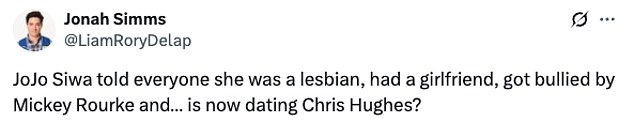 “Jojo Siwa i Chris Hughes koji su se okupljali kroz Big Brother nisu bili na mojoj Bingo kartici” “Jojo Siwa koji je sjedio u engleskom pubu nije bio na mojoj Bingo kartici 2025.”: “Jojo Siwa je svima rekao da je lezbijka, je li djevojku maltretirala Mickey Rourke i … sada”. ” ” JoJo i Chris, ako ste pronašli sreću, onda sam sretan zbog vas, krenite naprijed, ostavite trolove iza sebe i živite svoj život, poželite sve najbolje prema vama ‘.