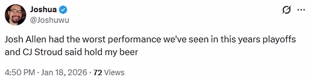 ‘Josh Allen imao je najgoru izvedbu koju smo vidjeli u ovogodišnjem doigravanju, a CJ Stroud je rekao da čekam moje pivo’, našalio se drugi.