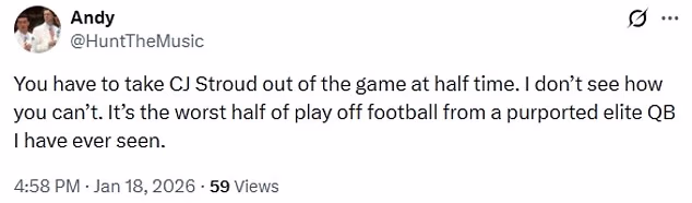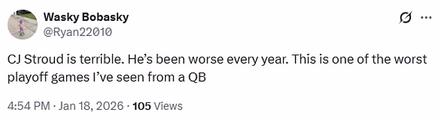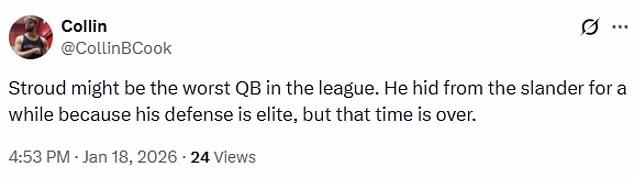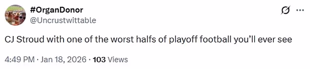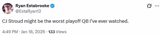 Drugi je objavio: ‘CJ Stroud je užasan. Svake godine mu je sve gore. Ovo je jedna od najgorih utakmica doigravanja koje sam vidio od QB-a.’