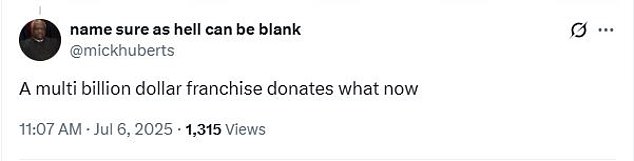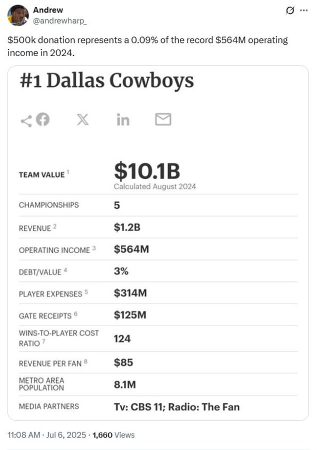 “Donacija od 500 tisuća dolara predstavlja 0,09% rekordnog operativnog prihoda od 564 milijuna dolara u 2024. godini”, rekao je jedan navijač Cowboysa.