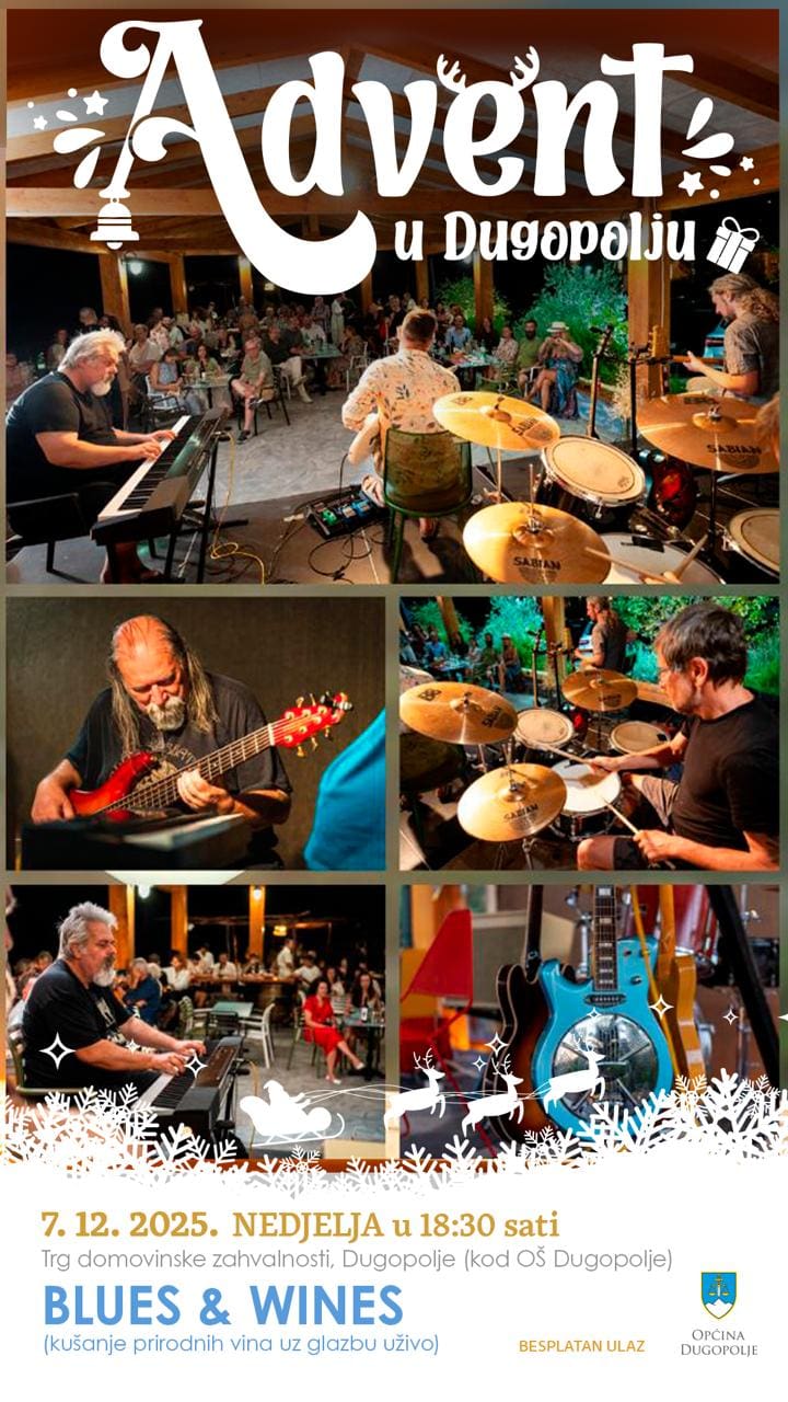 Dobra atmosfera nastavlja se u nedjelju, 7. prosinca, uz jedinstvenu večer Blues&Wines također na Trgu domovinske zahvalnosti. Od 18:30 h uživat ćete uz blues glazbu uživo i kušanje prirodnih vina.