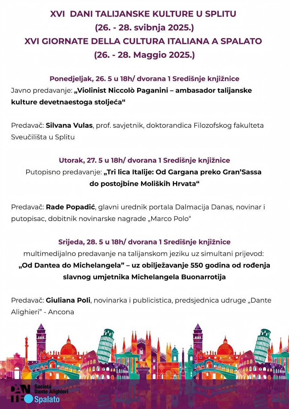Svake godine krajem svibnja hrvatsko-talijanska udruga Dante Alighieri organizira,u suradnji s drugim splitskim kulturnim institucijama, manifestaciju Dani talijanske kulture, ove godine 16. po redu. Sva događanja zamišljena su u vidu predstavljanja talijanske umjetnosti, jezika i kulture.