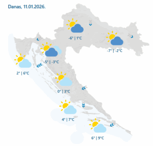 Prema najnovijoj prognozi DHMZ-a, jutarnje temperature 11. siječnja na kopnu će se kretati oko -9 °C ili niže, dok se dnevne vrijednosti u većini područja neće puno popeti iznad nule. Takvi uvjeti karakteristični su za sredinu siječnja i ukazuju na duboko prisustvo hladne zračne mase nad Hrvatskom.