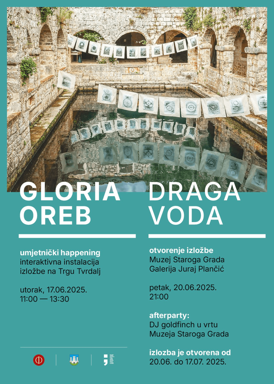 U utorak, 17. lipnja 2025., od 11 do 13:30 sati na Trgu Tvrdalj u Starome Gradu održat će se umjetnički happening i interaktivna instalacija kojom će započeti izložba “Draga voda” renomirane hrvatske slikarice Glorie Oreb. Ovaj vizualno snažan čin u povijesnom srcu grada bit će uvod u multimedijalnu izložbu koja kroz crtež, prostor i vodu progovara o povezanosti čovjeka s prirodom, ali i o memoriji prostora.