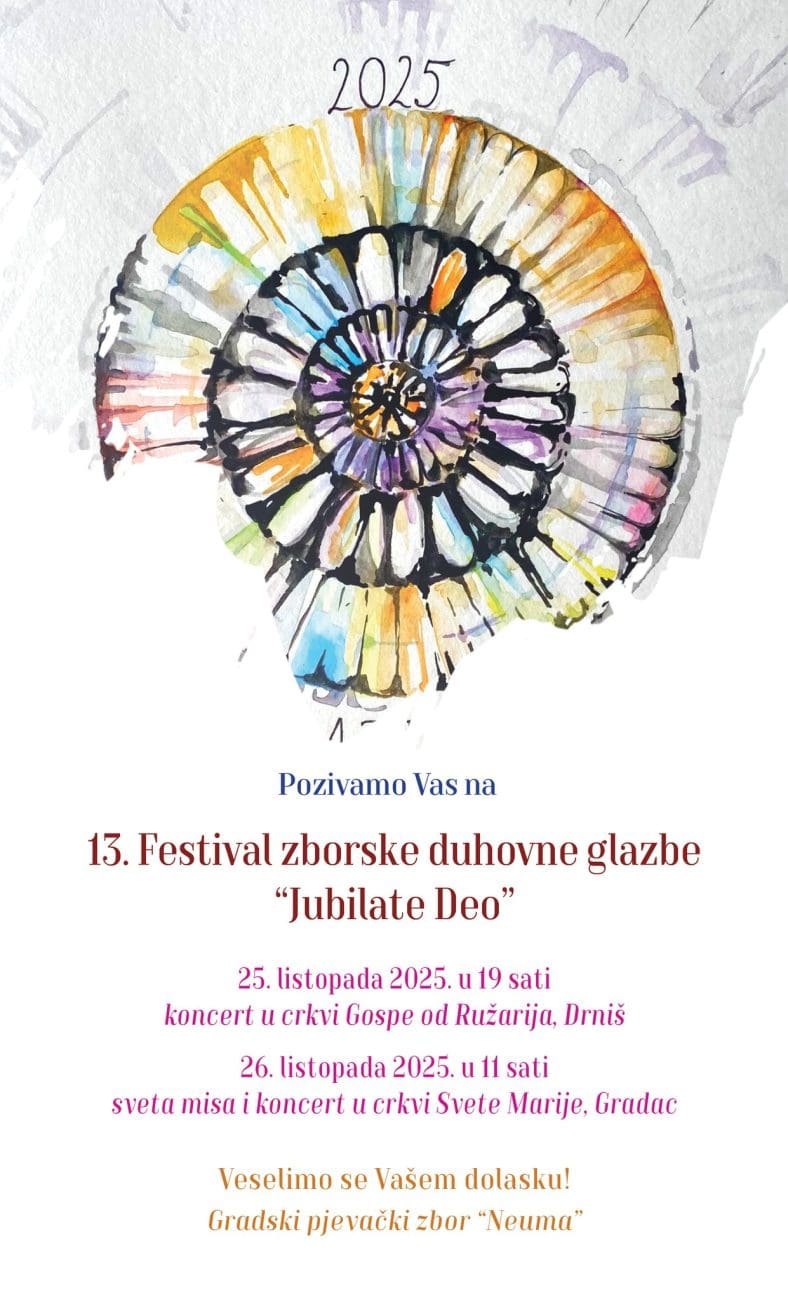 Nadolazećeg vikenda, 25. i 26. listopada 2025., u Drnišu i Gradcu održat će se 13. Festival zborske duhovne glazbe „Jubilate Deo“, tradicionalna manifestacija koja okuplja zborove iz cijele Hrvatske u slavlju duhovne pjesme i zajedništva.
