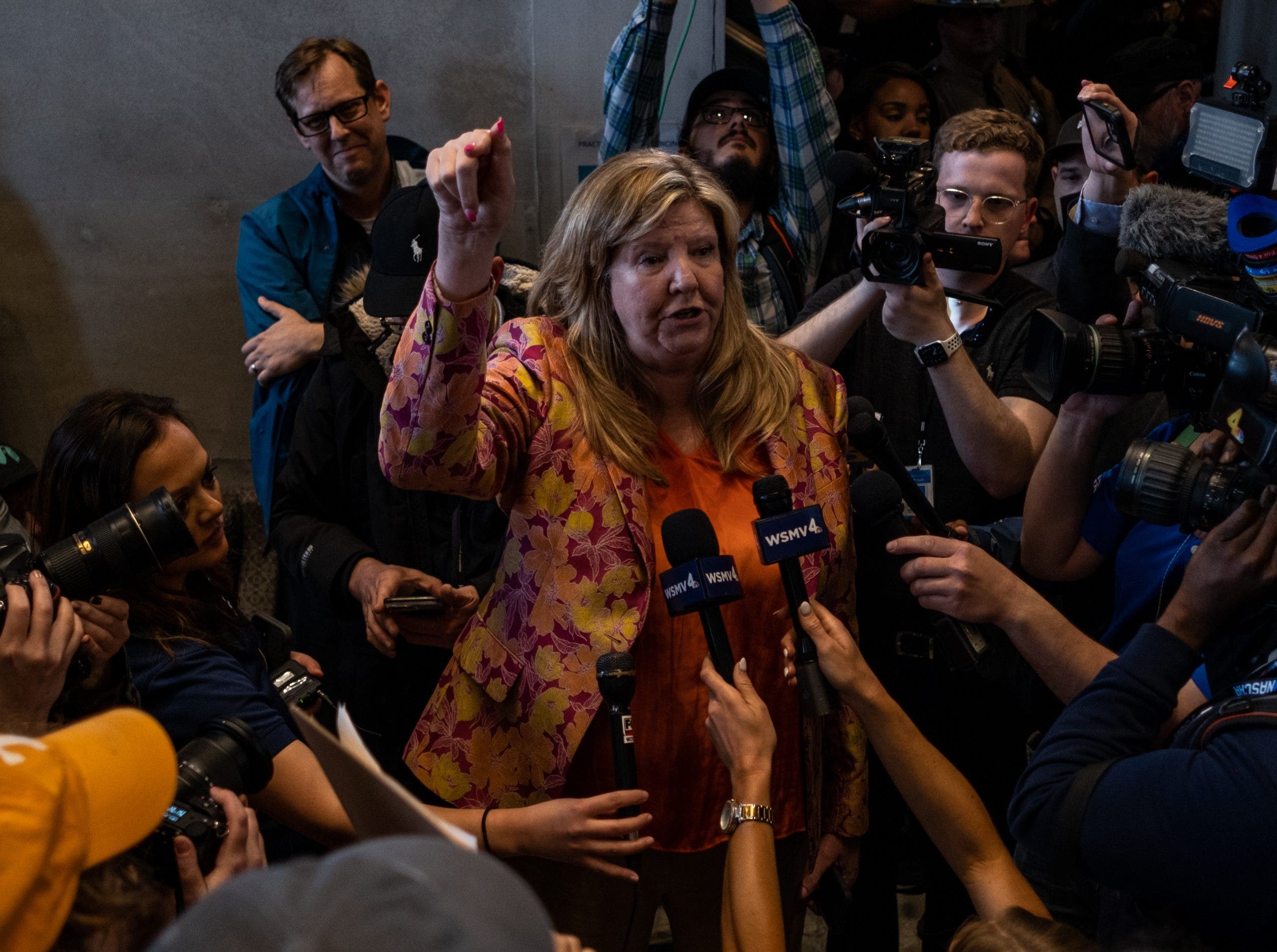 Zastupnica demokratske države Gloria Johnson iz Knoxvillea govori nakon glasovanja za izbacivanje Justina Jonesa iz Nashvillea iz upravnog tijela 6. travnja 2023. u Nashvilleu, Tenn.