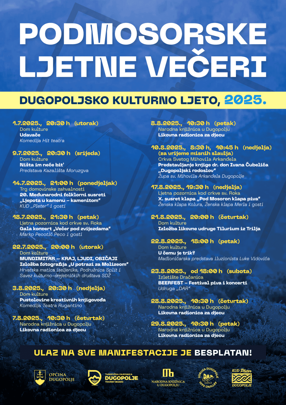 Cijeli program rezultat je suradnje Općine Dugopolje, Turističke zajednice Općine Dugopolje, Narodne knjižnice u Dugopolju, KUD-a “Pleter” Dugopolje i udruge DAR. Ulaz na sve manifestacije je besplatan, a detaljne informacije o lokacijama i rasporedu dostupne su na službenim stranicama organizatora.
