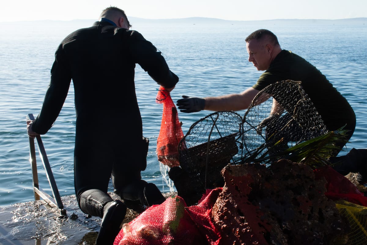 Lokacija koja je, nažalost, redovito izvor otpada pod morem, na kopnu je pričala drugačiju priču. Subota jutro, dan prije prvog dana zime, je više nalikovala ranoj, suncem okupanoj jeseni. I dok su sudionici uživali u jutarnjoj kavi i doručku uz božićne pjesme, organizatori su provodili daljnje pripreme za skori zaron.
