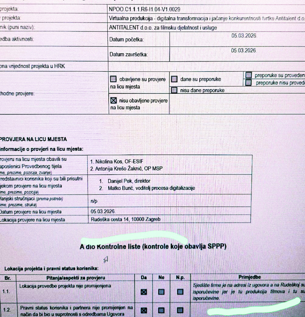 “Projekt Virtualna produkcija – digitalna transformacija i jačanje konkurentnosti tvrtke Antitalent d.o.o. proveden je u cijelosti u skladu s odredbama poziva i uvjetima ugovora o potpori. Sjedište tvrtke Antitalent d.o.o. je od osnivanja 1995. te početka poslovanja 2007. godine u Zaprešiću. Oprema koja je nabavljena u sklopu projekta koristi se za produkciju audiovizualnih djela koja se po potrebama projekata snimaju na različitim lokacijama. U vrijeme isporuke korištena je za potrebe našeg projekta koji se tada snimao u Zagrebu, a ista oprema će na našim idućim projektima biti smještena u Splitu, u Međimurju ili na kojoj god lokaciji ćemo provoditi snimanje projekata – što je i cilj i smisao nabave takve opreme. Projekt cijelo vrijeme provedbe nadzire nadležno državno tijelo s kojim u potpunosti surađujemo i spremni smo uvijek pružiti sve informacije potrebne za njihov rad”, glasi Pekov odgovor na sedam konkretnih pitanja. Slijedi “dobronamjeran savjet”.