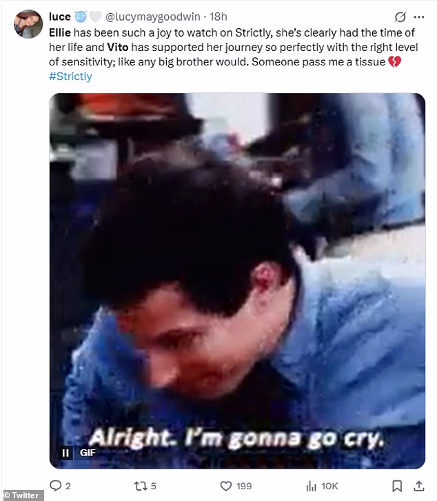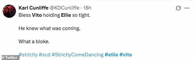 ‘Bilo je pravo zadovoljstvo gledati Ellie na Strictlyju, očito se dobro zabavila, a Vito je tako savršeno podupro njezino putovanje s pravom razinom osjetljivosti; kao što bi svaki veliki brat. Neka mi netko doda maramicu #Strogo…