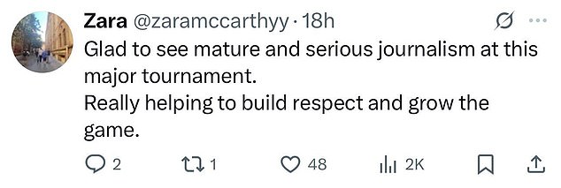 Drugi je dodao: ‘Drago mi je vidjeti zrelo i ozbiljno novinarstvo na ovom velikom turniru. Stvarno pomažući u izgradnji poštovanja i rastu igre. ‘