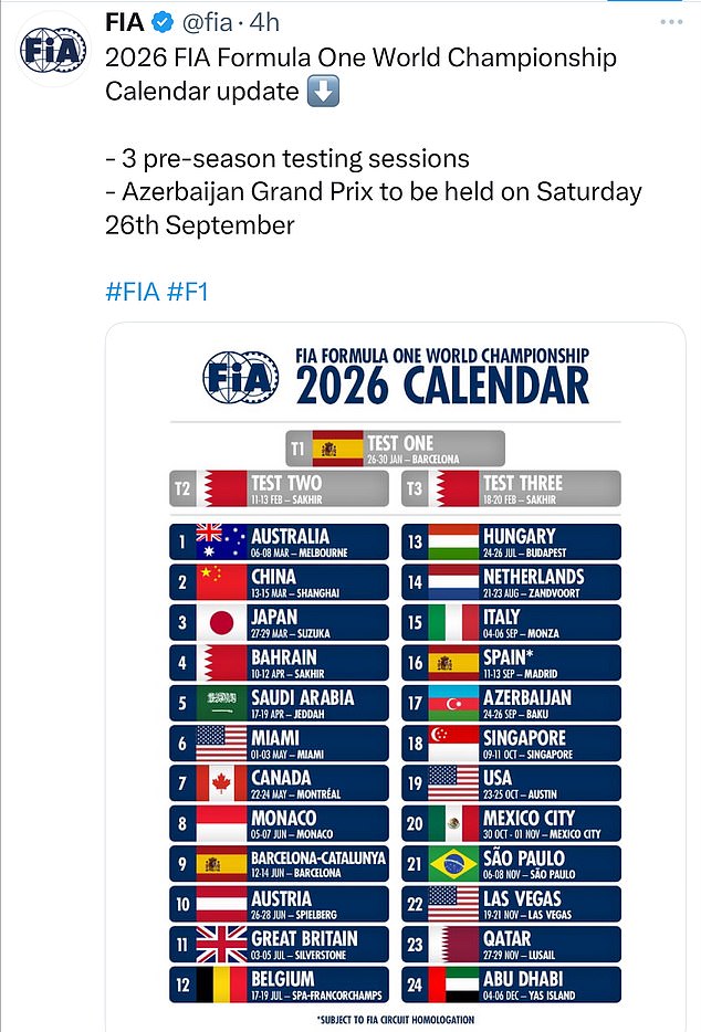 Azerbejdžan je 17. utrka sezone 24 utrke i sve su ekipe obaviješteni o tom potezu.