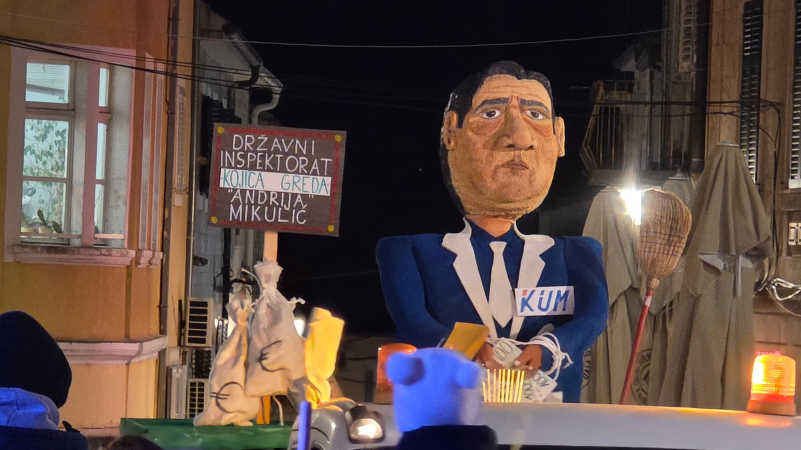 Pred “(ne)časnim sudom” našao se bivši glavni državni inspektor, simbolično prikazan kako izlazi iz kante za otpad, dok mu iznad glave visi natpis “Kojića greda”, da se zna o čemu je riječ i kome se prašina digla.