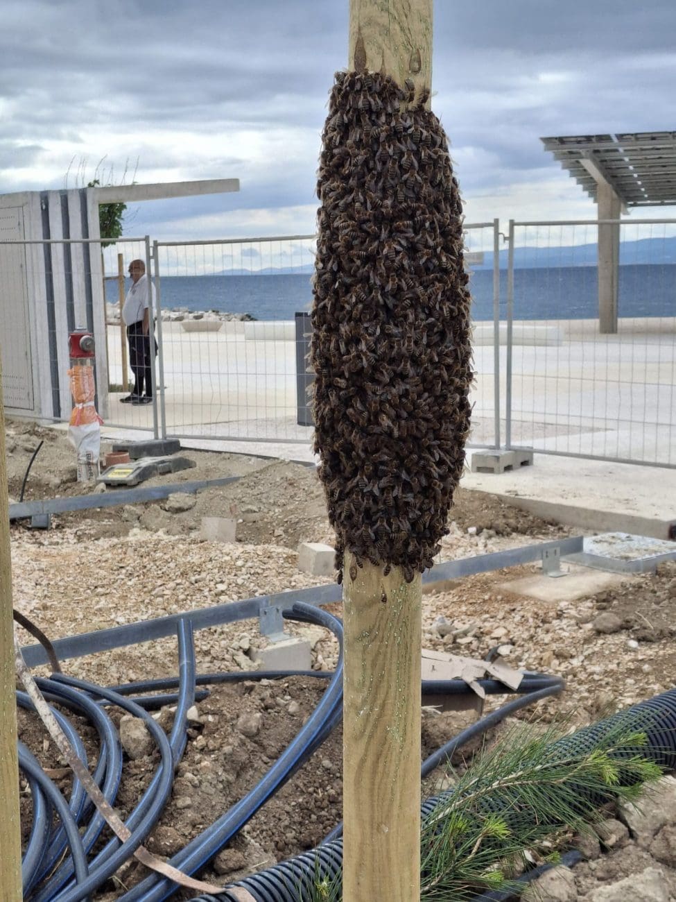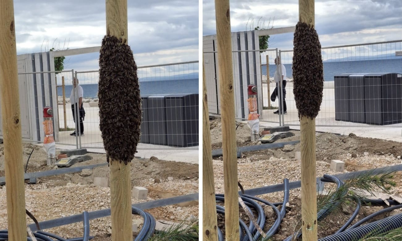 Na gradilištu na Žnjanu se skupio roj pčela. Pčelice su se narojile na jednom drvenom stupu, a iako prizor izgleda pomalo zastrašujuće – nemojte paničariti ako ih vidite.