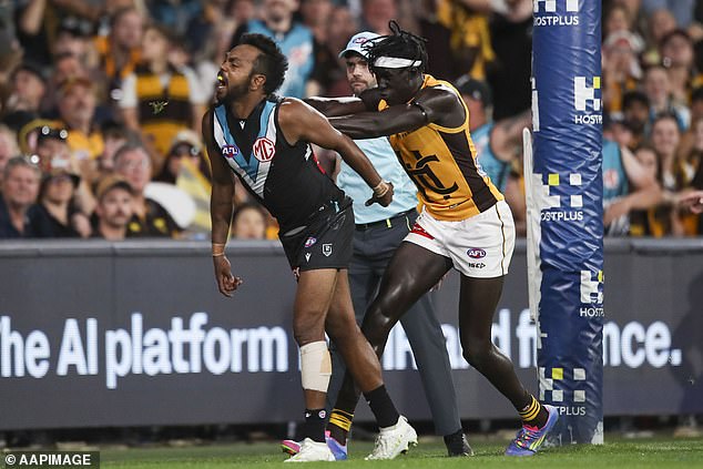 Willie Rioli udario je dvostruki gol nakon što ga je gurnuo u leđa Hawthorn’s Changkuoth Jiath