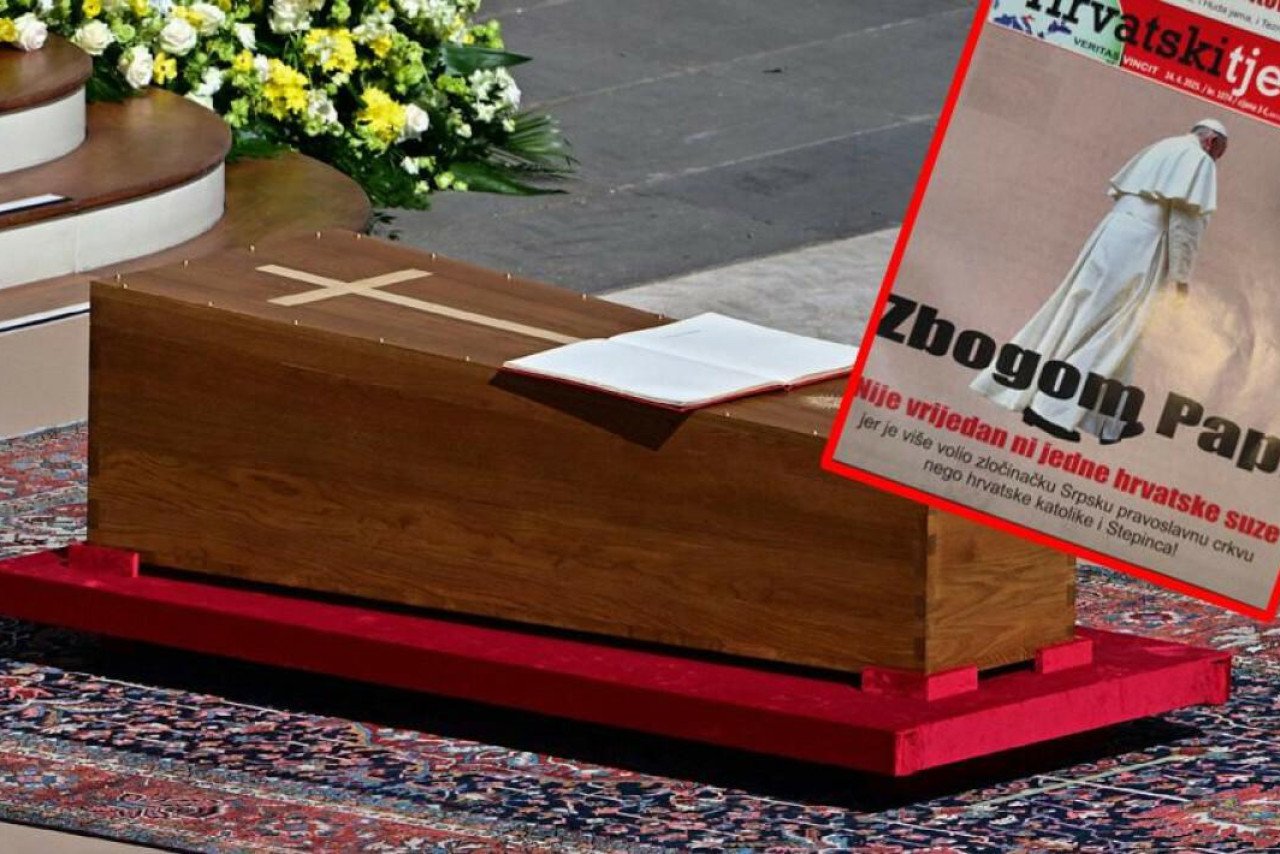 “Zbogom Papi: Nije vrijedan ni jedne hrvatske suze jer je više volio zločinačku Srpsku pravoslavnu crkvu nego hrvatske katolike i Stepinca!”, poruka je kojom se Hrvatski tjednik – glasilo “pravovjernih” hrvatskih nacionalista – s naslovnice novog broja oprostio od pape Frane, koji preminuo na Uskrsni ponedjeljak 21. travnja.