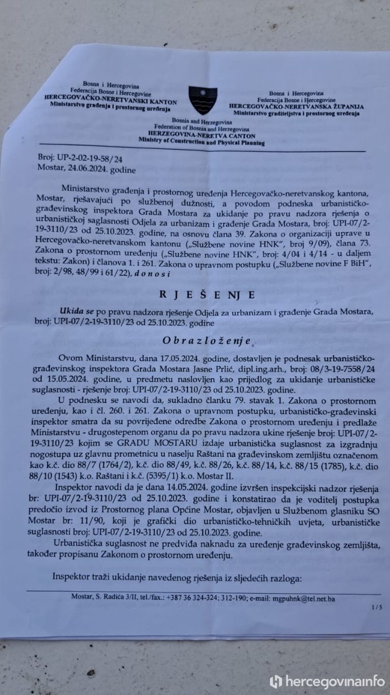 U posjedu smo rješenja Ministarstva prostornog uređenja HNŽ broj UP-2-02-19-58/24 od 24. lipnja 2024., kojim se ukida urbanistička suglasnost na temelju koje Grad Mostar sada izvodi radove (rješenje Grada: UPI-07/2-19-3110/23).