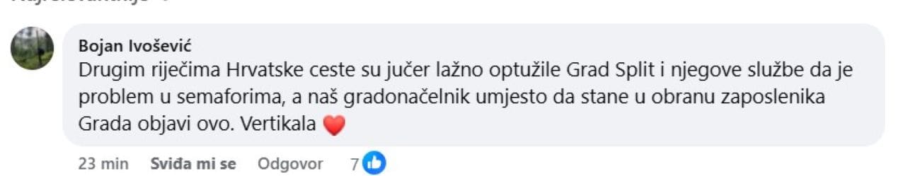 – Drugim riječima, Hrvatske ceste su jučer lažno optužile Grad Split i njegove službe da je problem u semaforima, a naš gradonačelnik umjesto da stane u obranu zaposlenika Grada objavi ovo. Vertikala.