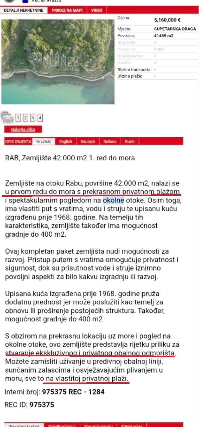 U međuvremenu smo pronašli i originalni oglas kojim je vlasnik oglasio prodaju zemljišta za 5.160.000€ za 41.549m2 uz, kako nam tvrde čitatelji s Raba, lažne navode o tome da se na zemljištu nalazi zgrada izgrađena prije 1968.godine i fantomsko nepostojeće pravo za gradnju na tom zemljištu.