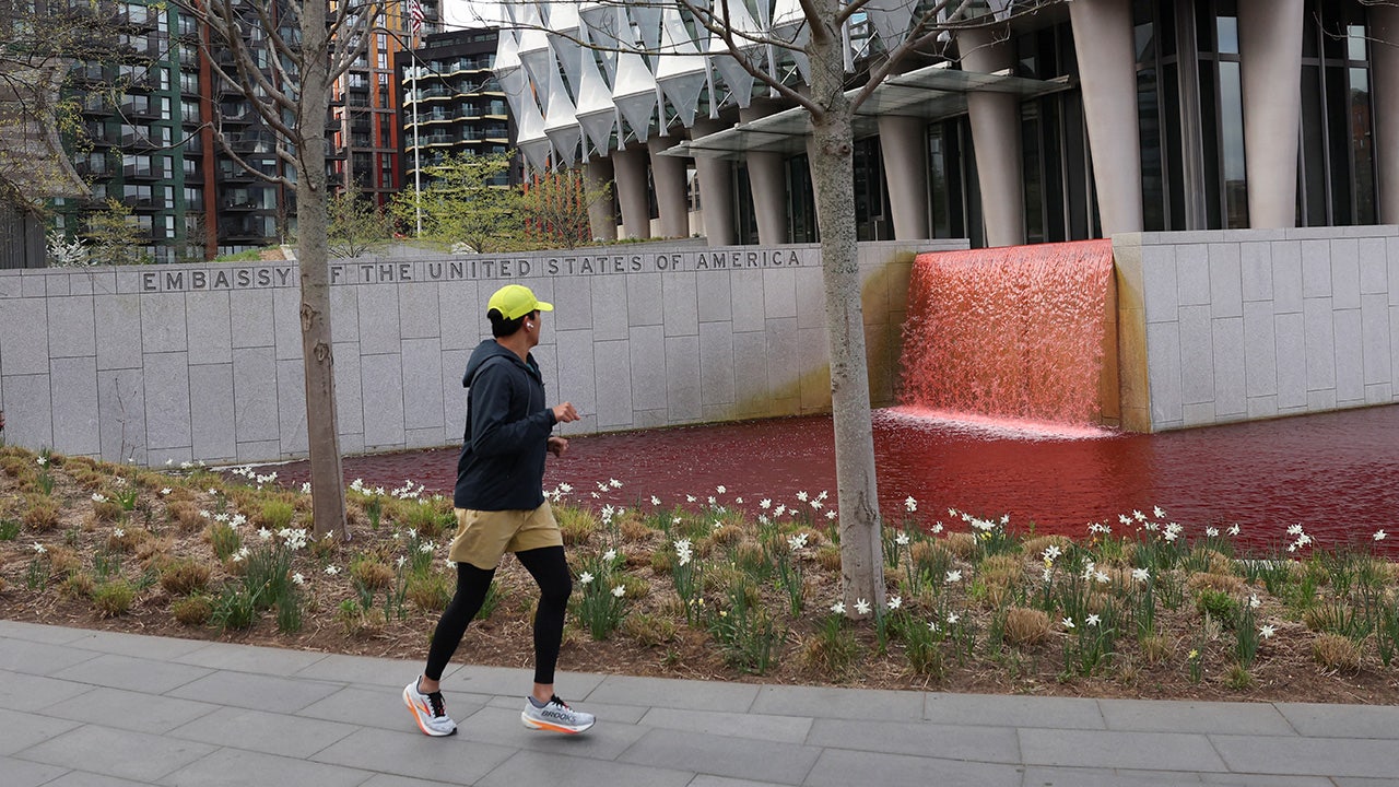 Muškarac trči pored američkog ribnjaka veleposlanstva koji je u četvrtak, 10. travnja, ispunio crvenu boju od strane Greenpeace aktivista u Londonu. (Reuters/Suzanne Plunkett)