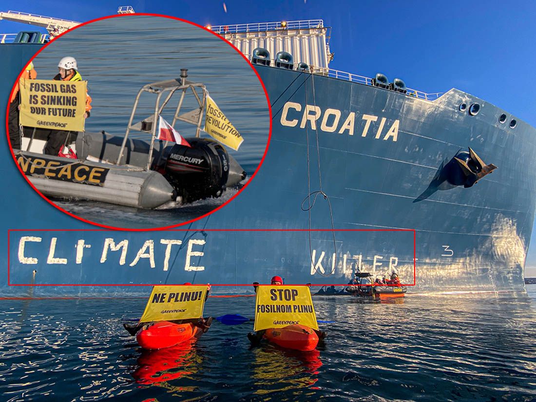Aktivisti “Greenpeace”-a u ponedjeljak su izveli akciju na LNG terminalu na Krku, kad su se približili gumenim čamcima i ispisali poruku na terminalu “Climate Killer (Ubojice klime)&quo