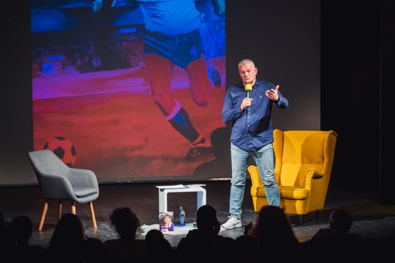 Gudelj, jedan od trojice gostiju večeri, odavno je opjevan igrač Hajduka. Seniorski bijeli dres prvi je put obukao krajem sedamdesetih, a prestao je igrati već s 26 godina, nakon što je obolio od hepatitisa B. Danas, 37 godina poslije, potpuno je zdrav i izgradio je bogat život izvan terena: devetnaest godina trenirao je mlađe selekcije hrvatske reprezentacije, diplomirao na Kineziološkom fakultetu, suosnovao Svećeničku nogometnu reprezentaciju i Split Stars Team te vodio jedno kazalište. O njemu su već napisane knjiga i snimljen dokumentarac, a u pripremi je i igrani film.
