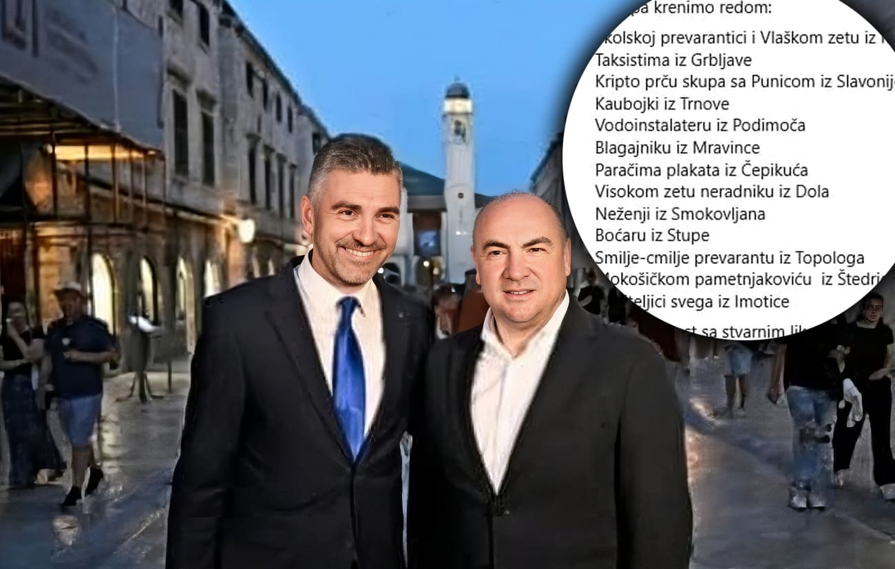 Međutim, ono što je izazvalo posebnu pozornost jest dio poruke u kojem se na krajnje neobičan način obraćaju navodnim političkim protivnicima. Redaju se nadimci i opisi poput “školska prevarantica”, “kripto priča”, “kaubojka”, “neženja”, “blagajnik iz Mravince” i “boćar iz Stupe”, uz navođenje mjesta iz kojih ti ljudi navodno dolaze. Na kraju navode i da je “svaka sličnost sa stvarnim likovima namjerna”, uz rečenicu: “Tko se prepozna, znat će zašto se prepoznao.”