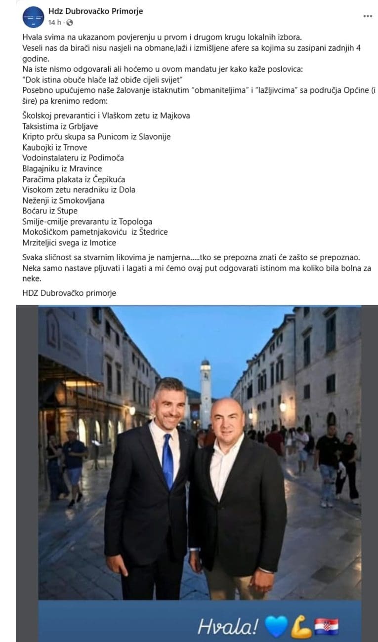 Iako u uvodu poruke izražavaju zahvalnost na ukazanom povjerenju u oba kruga izbora, daljnji sadržaj objave jasno izlazi iz okvira klasične političke komunikacije. HDZ Dubrovačko primorje poručuje kako tijekom kampanje nisu odgovarali na, kako navode, “obmane, laži i izmišljene afere”, ali da će u novom mandatu “odgovarati istinom, ma koliko bila bolna”.